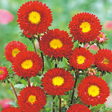 花径約5cmで黄色い花芯と花びらのコントラストが美しい。分枝力が極めて旺盛な多花性で、アスターの中でも耐病性、耐寒性が強く、作りやすい品種。切り花に好適。
