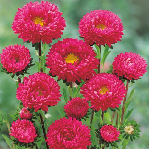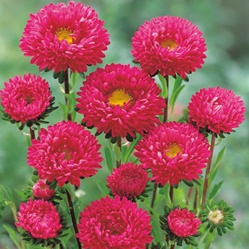 花径約5cmで黄色い花芯と花びらのコントラストが美しい。分枝力が極めて旺盛な多花性で、アスターの中でも耐病性、耐寒性が強く、作りやすい品種。切り花に好適。