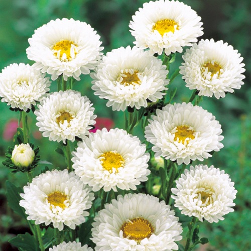 花径約5cmで黄色い花芯と花びらのコントラストが美しい。分枝力が極めて旺盛な多花性で、アスターの中でも耐病性、耐寒性が強く、作りやすい品種。切り花に好適。