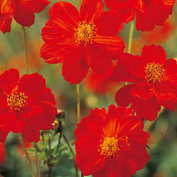 「秋桜」といわれるコスモスとは別種。草丈は約50cm程で、株は横にも張る。早咲きの性質で、約5~6cmの目のさめるような橙紅色の花が咲く。夏の暑さにも強い花だが、高温では花色はやや淡くなる。