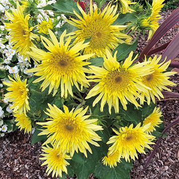 レモン色の珍しいセミダブル花の矮性種。分枝よくいくつも花をつける。キク科