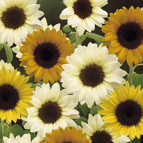 黒芯の3色ミックス。オレンジ、レモン、ホワイトの調和が美しく映える。切り花にも向く。