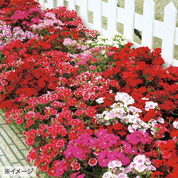 石竹と撫子の種間雑種で四季咲きダイアンサス。矮性で花壇や鉢植えなどに向き、世界中で人気。F1テルスター系の多色混合。ナデシコ科