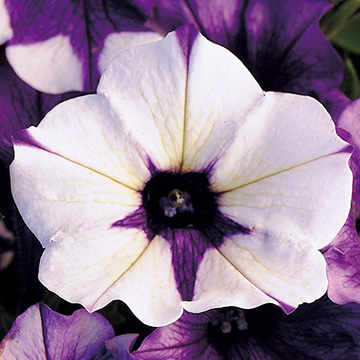 濃紫と白が絶妙なバランスで出現する個性的な花色で、気温差により花色の割合が変化する。こんもりとまとまる這性で小輪タイプ。草姿、花色、花形も多様なバリエーションが魅力で、暑さ、乾燥にも強く、夏の花壇を彩るのに欠かせない。ナス科