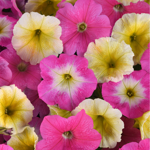 イージーウェーブ系の特長はそのままに、従来種よりも低日照下でも開花し始めるため、早期から花が楽しめる。 中輪タイプの花をまとまりよくつける。花数の多さと連続開花性が特長。黄色~ローズ系のミックス花色。 花径5~7cm、草丈15~30cm、株張り75~100cm。
