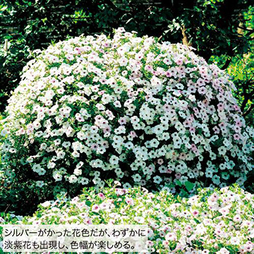 シルバーがかった花色だが、わずかに淡紫色も出現し、色幅が楽しめる。圧倒的な花数が魅力。株姿はマウンド状にこんもりと育つ。〈A.A.S.受賞〉