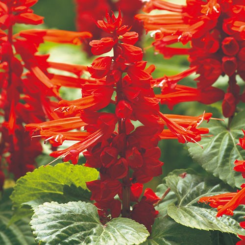 サルビアの一般的なタイプ。緋赤色以外にも多彩な色を楽しめる。すくすく育ち秋まで開花。タネから育てられる人気の草花。