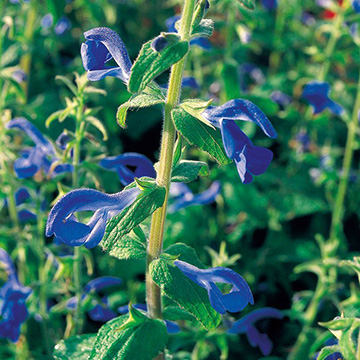 神秘的なロイヤルブルーの花が圧巻の美しさ。よく分枝して多数の花を咲かせるコンパクト種。夏秋花壇には欠かせないサルビア。真っ赤な花の印象が強いが、それ以外の花色も多く、花穂の形も様々。シソ科