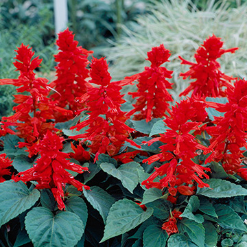 サルビアの一般的なタイプ。花期が長くて、緋赤色以外にも多彩な色を楽しめる。早咲きタイプで、ボリューム感ある花穂が長期間咲く。光沢ある濃い緑色の葉で、とても育てやすい。