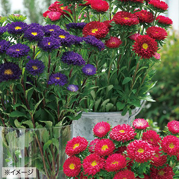 お供え花に欠かすことのできないアスターの定番シリーズ。花径約5cmの八重咲きでフザリウム耐病性に特に優れる。花弁の重ねや発色もよく、切り花に好適。小葉で基部分枝が少なく、密植栽培にも向く。