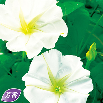和名の「ヨルガオ」の通り、夕方の薄暗くなる頃に開花して翌朝日光が当たる頃にしぼむ夜咲き性。芳香がある。花色は純白色。花径約15cmの大輪純白花で芳香がある。暑さに強く、つる性は非常によく伸びる。グリーンカーテンにも適す。ヒルガオ科