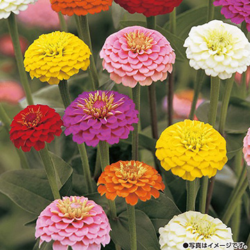 花は約4cmで、花びらの数が多く重ねのよい品種。花色は赤、桃、紫紅、黄、白などの混合。丈夫で作りやすく、秋遅くまで花が楽しめる。