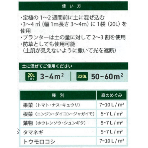 ■施用目安:土壌改良の場合、土に対して2~3割、3~4m2に対して20L。