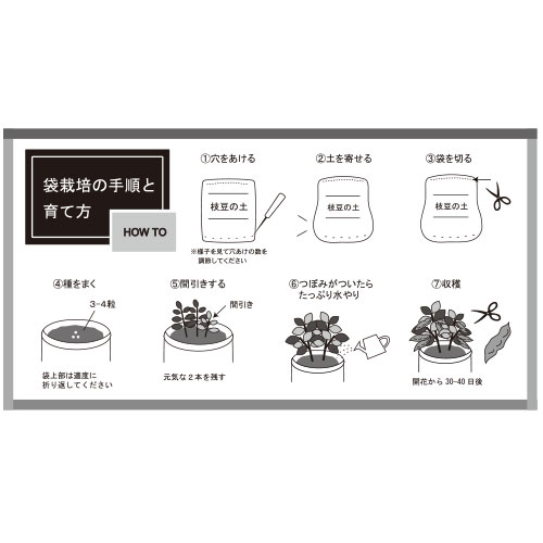 ベランダや庭先でも手軽に始められるそのまま栽培できる袋。枝豆に適した肥料を設定。収穫が待ち遠しくなるようなパッケージデザイン。(日本製)