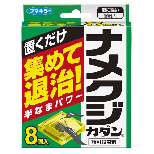 ナメクジやカタツムリに対して誘引・駆除効果があります。置くだけなので、ベランダや庭まわりなど薬剤をまけない場所に好適です。雨や散水に強い容器設計で、約1~3ヵ月効果が持続します。(日本製)