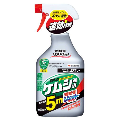 直噴散布でケムシ、イラガなど高い所にいる書虫や近寄りたくない書虫を遠くから狙い撃ち。ケムシには速効性と1週間の持続性(チャドクガ、アメリカシロヒトリ・若齢幼虫)があり、散布後に発生した害虫も退治。浸透移行性により葉の中や散布液がかかりにくい場所に生息している害虫にも効果的です。(日本製)
