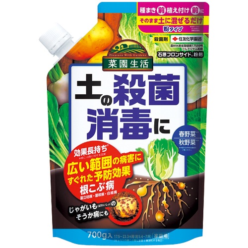 ジャガイモのそうか病、アブラナ科野菜の根こぶ病をはじめ、キャベツの苗立枯病や菌核病、ネギの白絹病など、広範囲の病害に予防効果があります。効果が持続し、長期間にわたって根こぶ病の被害を抑えます。(日本製)