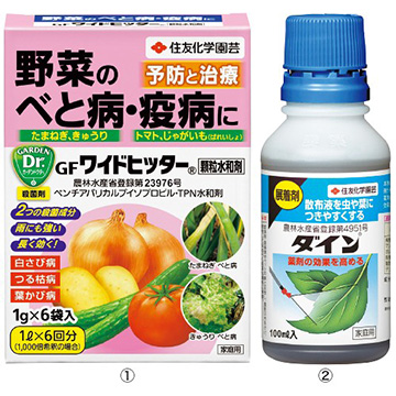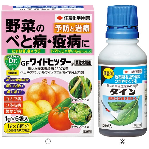 (1)GFワイドヒッター顆粒水和剤:べと病や疫病に対して優れた予防・治療効果があるベンチアバリカルブイソプロピルと幅広い病気に予防効果があるTPNを配合した殺菌剤です。植物体に成分が染み込む「浸達性」があり有効成分が雨などに流されにくく、効果が持続します。(日本製)