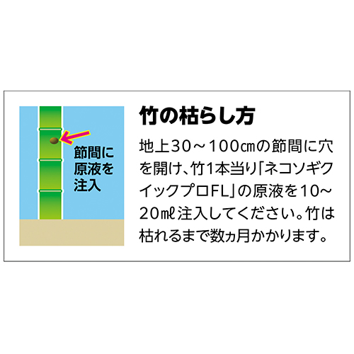 ※竹類の竹稈注入処理の場合は、処理竹から15m以内に発生したタケノコを食用に供さないでください。また、縄囲いや立て札によりタケノコが採取されないようにしてください。