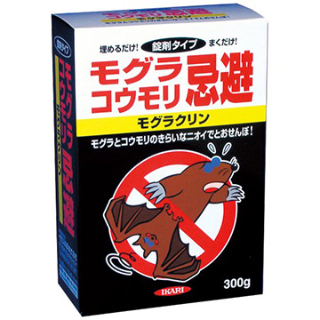 錠剤を生息場所にまくだけで、モグラ・コウモリをニオイで追い出す。効果はモグラに約3カ月間、コウモリに約1カ月間。コウモリ対策として、「スーパーコウモリジェット」と併用すると、より効果を得られます。(日本製)