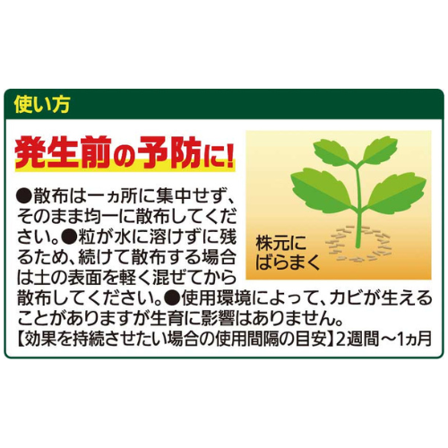 ■施用方法:散布は一カ所に集中させず、そのまま均一に散布してください。(粒が水に溶けずに残るため、続けて散布する場合は土の表面を軽く混ぜてから散布してください。)