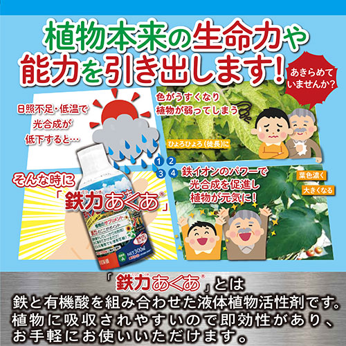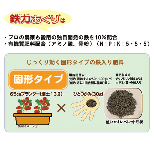 植物の生長に必要な鉄分は光合成を行う葉緑素の合成に不可欠な栄養素です。「鉄力シリーズ」は植物が吸収しやすい形態で効率よく安定供給し、植物を元気に育てます。元肥・追肥に効果的な「NEW鉄力あぐり®スーパー」はアミノ酸、骨粉も配合されてさらにパワーアップ!(ペレット状)(日本製)