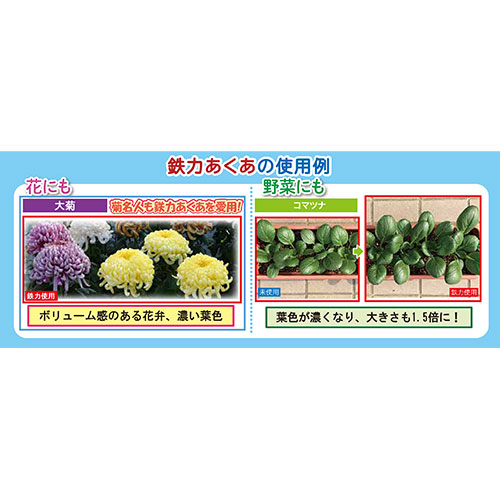 A 鉄鋼会社が開発した特殊な鉄を使用することにより、植物が吸収しやすい鉄イオンを効率よく安定的に供給する画期的な商品です。