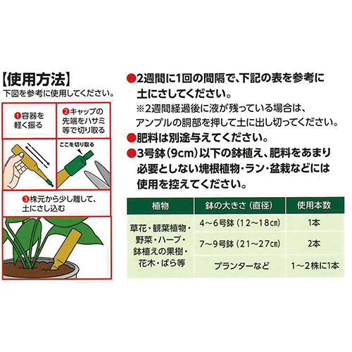 ※2週間経過後に液が残っている場合は、アンプルの胴部を押して土に出し切ってください。