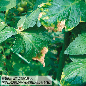 トマトの生育期間中に、通常液肥と交互に本品を施用し、カリを過不足なく与えることで、健全な生育を図れます。また、豊富に含まれるカリ成分が、拮抗作用によってチッソの過剰吸収も抑制。過繁茂防止を促します。(品質向上、日もち性UP。キュウリ・メロン・スイカ・イチゴなど、ほかの果菜類・花弁にも有効です)(日本製)