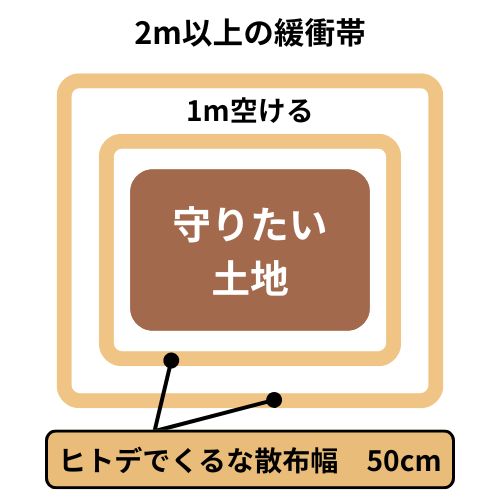 ・地上を移動する動物の場合は、侵入してほしくない場所の周りを囲むように、50cm幅程度の帯状になるよう連続して散布します。