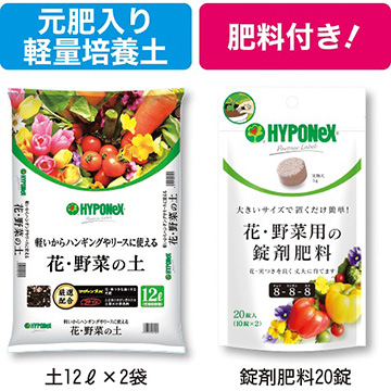 花・野菜の土 12L×2袋、 花・野菜用の錠剤肥料 20錠