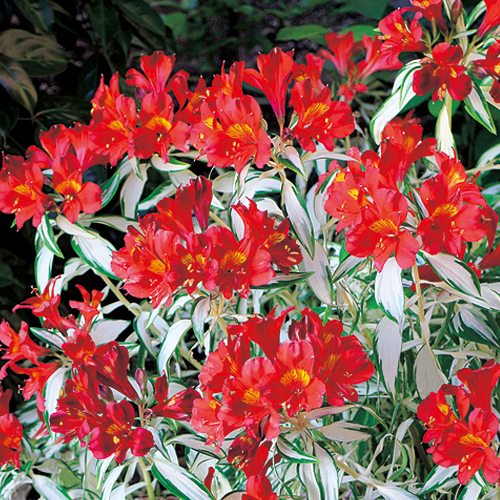 葉に中斑が入る珍しいタイプ。斑の色は最初やや黄みを帯び、次第にクリーム色~白に変化。オレンジスカーレットの鮮やかな花色とのコントラストが美しく目を引く。夏季常緑性。ユリズイセン科