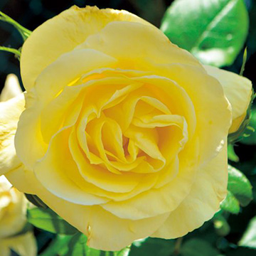 イタリア語で「照らす」という名をもつ、さわやかなライトイエローの丸弁平咲き。大きく育つと房咲きになる。耐病性に優れ、海外コンクールで多数受賞の優秀花。返り咲き。コルデス作出。バラ科