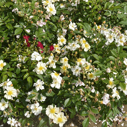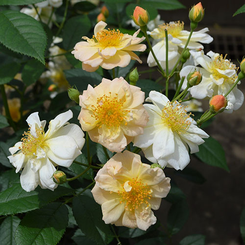 ランブラー・ローズには珍しい、黄色~中心濃い黄色の花はかわいらしい。春にたくさん咲く一季咲き。しなやかな枝に小さな花を房状に咲かせる、ランブラー・ローズの「シルエッタシリーズ」。コルデス作出。バラ科