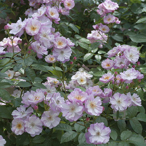 白地にラベンダー色がのる可愛らしい色合いで、秋にも咲く。しなやかな枝に小さな花を房状に咲かせる、ランブラー・ローズの「シルエッタシリーズ」。コルデス作出。バラ科
