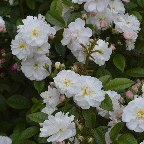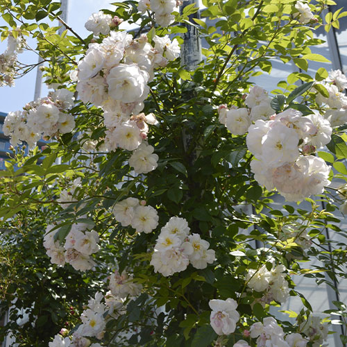 白地にピンクが乗る優しい色合いは、可愛らしく爽やか。秋にも咲く。しなやかな枝に小さな花を房状に咲かせる、ランブラー・ローズの「シルエッタシリーズ」。コルデス作出。バラ科
