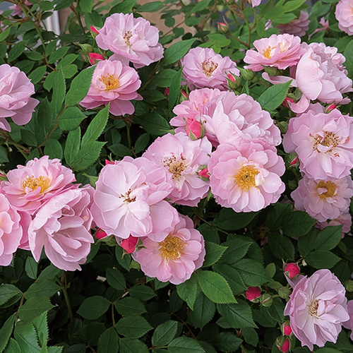 尖った花弁の先が特徴で、小さな花が株いっぱいに咲く姿がとても可愛らしいつるバラ。誘引しやすくコンパクトな仕立ても向く。ブローチのような花の姿から名付けられた。メイアン作出。バラ科