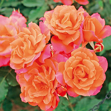 開花が進むにつれオレンジ色の花弁にピンクがのる華やかな半剣弁咲き。緑色の照り葉も美しくコンパクトな樹形で小スペースでも栽培可能。バラ科