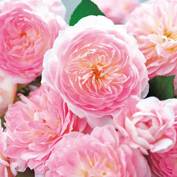 白にパウダーピンクが交じる花色で、中心部にクリーム色が入りふんわりした印象。コンパクト樹形で耐病性もあり育てやすい。バラ科