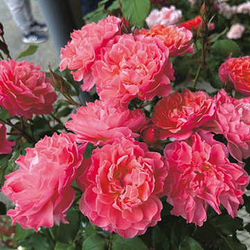 咲き始めがコーラルオレンジ~コーラルピンク花色へと変化する。波打つ花弁が整然とひしめくロゼット咲きの中輪種。次々につぼみが上がって、非常によく咲き、育てやすい。バラ科