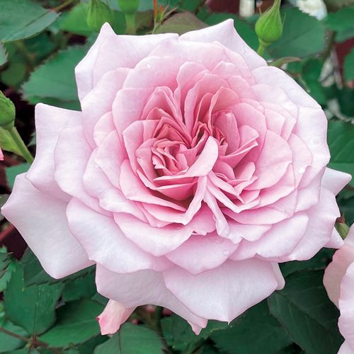 しっかりした波状弁の花びらは、秋になると藤色から深みのあるライラックグレーと変化し、移り変わる雰囲気が季節感を感じさせる。花つきが良く、7~8輪の房咲き種。樹勢は、コンパクトで育てやすい。トゲが少ないのが特徴。バラ科