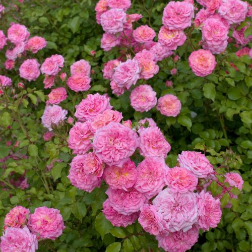 鮮やかなピンク色花弁が豪華に重なる八重咲。一枝に5~10輪の房咲きとなりボリュームたっぷり。成長するとこんもりした株姿になる。メイアン作出。バラ科