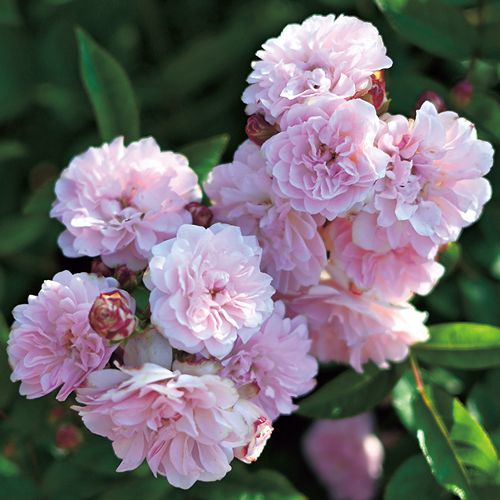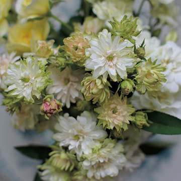 春は淡いさくらピンク~白色のかわいらしい小輪の花が房でたくさん咲く。夏は、グリーンがかる白や淡いピンクの花が咲き、特徴的な花形へ変化する。甘くやさしいティーの香り。株姿はコンパクトで繰り返しよく咲く。バラ科