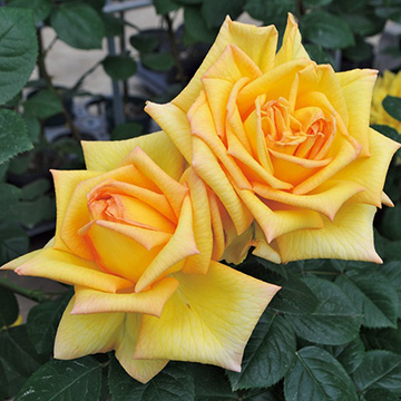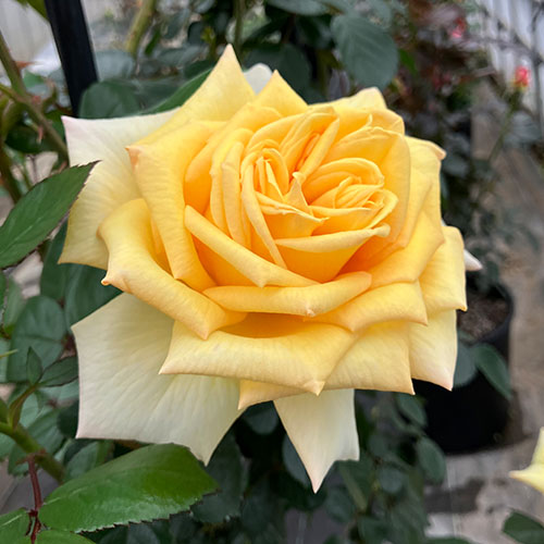 鮮やかな黄色が美しく、整った花形の大輪花。フランス語で「陽だまり」を意味する品種名のとおり、温かみを感じられ、優しい香りも楽しめる。株は直立性で良く伸び、暑さや病気にも強い。夏から秋にかけて長いシュートが出る事があるので、夏剪定は早めに行うのがおすすめ。メイアン作出。バラ科