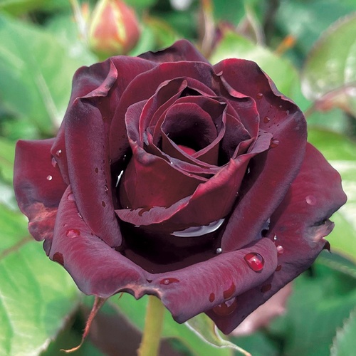 上質なベルベットのような光沢が印象的。黒みの強い色彩で光沢のある花びらを持つ個性的なバラ。咲き進むと、スイーツのカヌレの様な花色へ変化する。バラ科