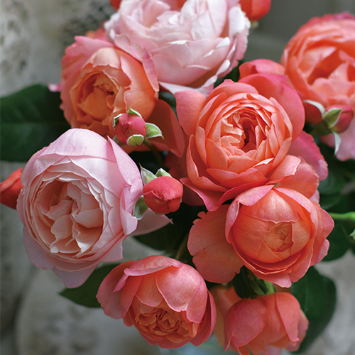 濃いめのオレンジにピンクがかるコロンとしたカップ咲き。フルーツとダマスクの甘い香り。果物のアプリコットを使ったタルト菓子をイメージして命名。コンパクトにまとまる樹形で耐病性も強く育てやすい。バラ科