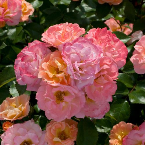 オレンジ、イエロー、アプリコットなどが交ざり合い、花弁裏は黄色を帯びる複雑で魅力的な花色。メイアン作出。バラ科