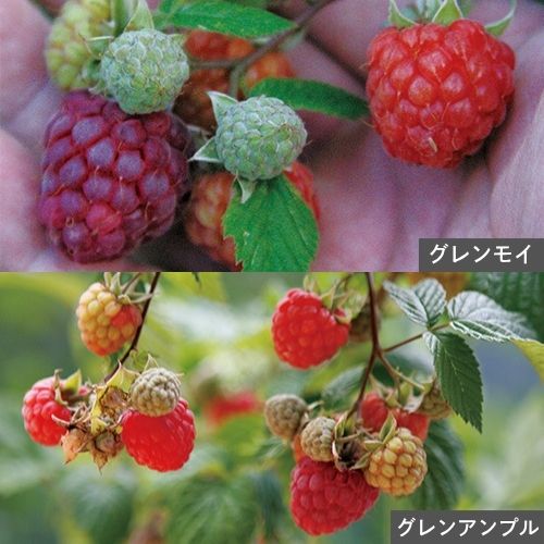 | 【商品情報】 | ■グレンモイ しっかりした風味と甘みで生食向き。アブラムシの抵抗性があり、家庭菜園でもしっかり育てやすい品種。 ■グレンアンプル 香り高く、一般的なラズベリーの約1.5倍ほどの大実で豊産。 |