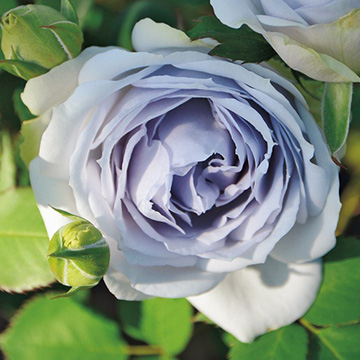 青藤色、丸弁八重咲き、中輪房咲きの花。春先や晩秋の直射日光が当たらない時は、赤みが少ない青色バラ。樹勢、耐病性、香りを合わせ持つ。バラ科