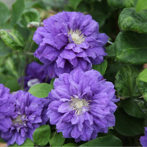 濃い青紫色の波打つ花弁が幾重にも重なり、非常に花形のよい八重咲き種。華やかで、存在感がある。返り咲き性もあり、使いやすい。キンポウゲ科。